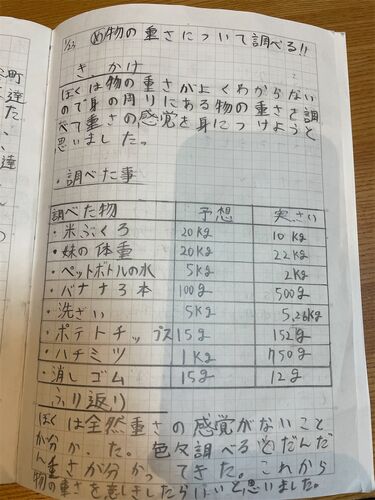 namoと、これまでにやってきた自分学習のノートを見ながら、振り返り。楽しかったやつどれ? これおもろかった。 とnamoが言うのは、これ。 物の重さについて調べる 家の中にあるいろんな物の重さを予想して実際の重さをはかってみる。 物の値段を知ろう 重…